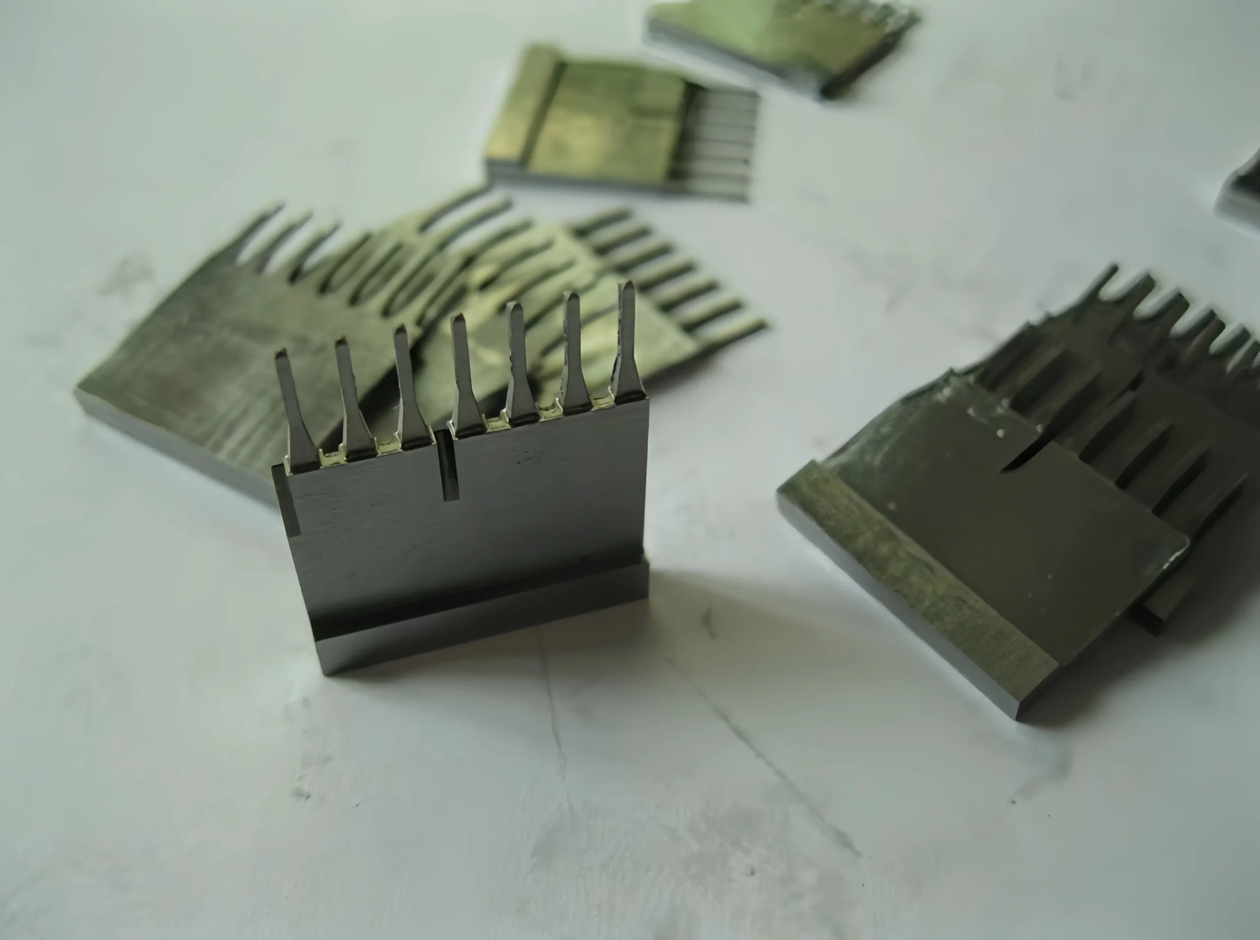 8 pin precision plastic injection mould components made by ShenZhen HUAKAIYU technology Co, Ltd., using Viking or LG steel, hardness 56-60HRC, for high-precision electronic connector manufacturing.