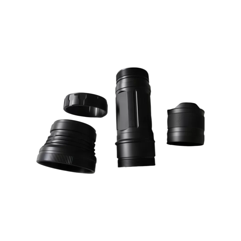 CNC machined red anodized 6061 aluminum flashlight body manufactured by ShenZhen HUAKAIYU Technology Co., Ltd., China precision plastic injection mould factory.
